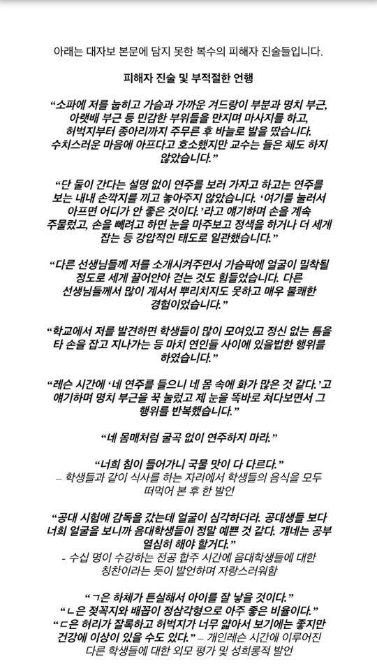 이 성명서에 따르면, S교수는 악기 지도를 이유로 여러 차례 학생들에게 불쾌한 신체 접촉을 시도했다고 합니다.