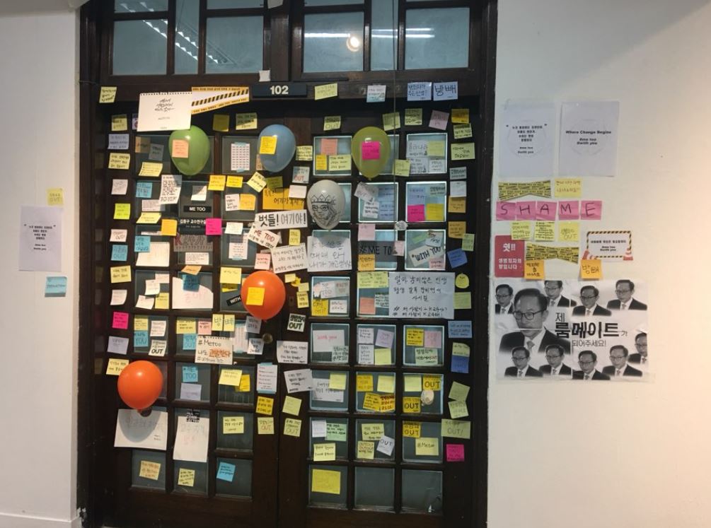 이화여자대학교 학생들이 '미투'(#Metoo)를 외치고 있습니다. 성폭력 의혹이 제기된 교수의 연구실에 수많은 포스트잇을 붙였습니다.