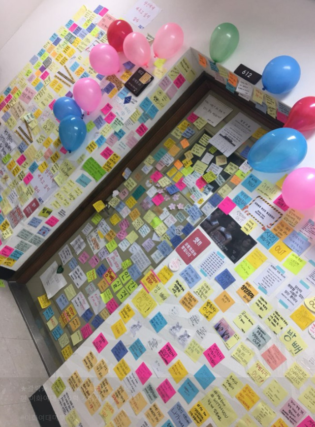 23일 SNS에는 '현 이화여대 성폭력 가해자 교수실 상황'이라는 제목으로 여러 장의 교수실 사진이 올라왔습니다. 색색 포스트잇과 풍선이 교수실에 붙어 있었는데요.