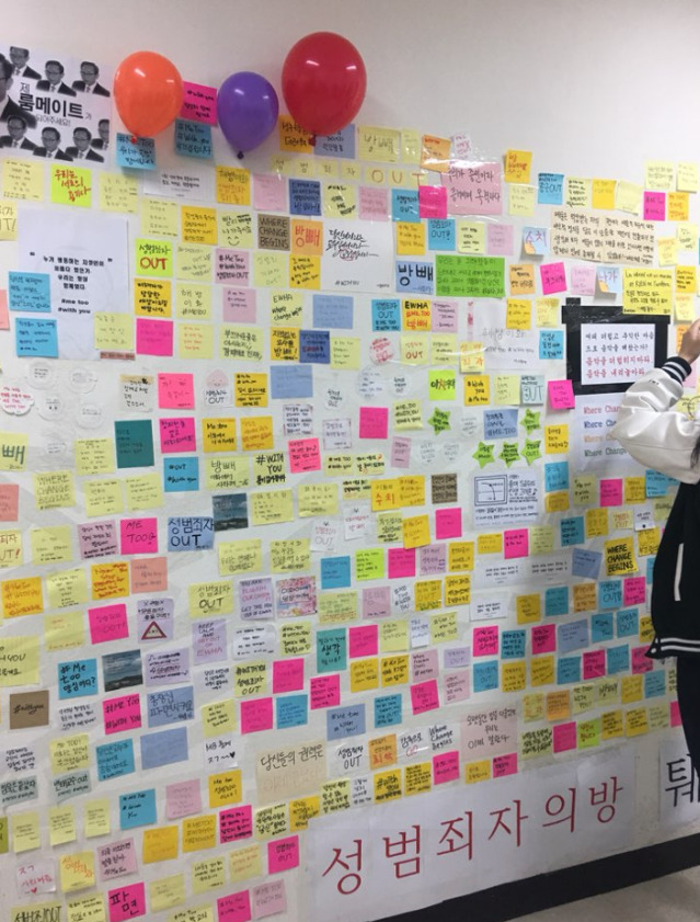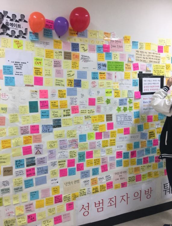 또 "우리는 꽃이 아니다. 우리는 불꽃이다"는 내용도 있었고요. 커다랗게 "성범죄자의 방, 퉤", "벗들! 여기야" 등 학생들의 참여를 유도하는 메시지도 있었습니다.