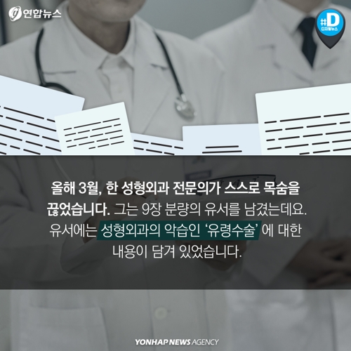 올해 3월, 한 성형외과 전문의가 스스로 목숨을 끊었습니다. 그는 9장 분량의 유서를 남겼는데요. 유서에는 성형외과의 악습인 '유령수술'에 대한 내용이 담겨 있었습니다.
