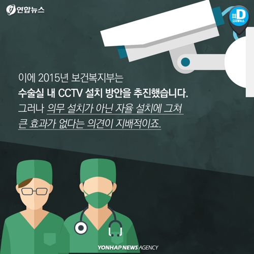 이에 2015년 보건복지부는 수술실 내 CCTV 설치 방안을 추진했습니다. 그러나 의무 설치가 아닌 자율 설치에 그쳐 큰 효과가 없다는 의견이 지배적이죠.