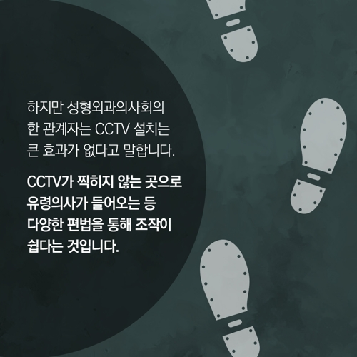 하지만 성형외과의사회의 한 관계자는 CCTV 설치는 큰 효과가 없다고 말합니다. CCTV가 찍히지 않는 곳으로 유령의사가 들어오는 등 다양한 편법을 통해 조작이 쉽다는 것입니다.
