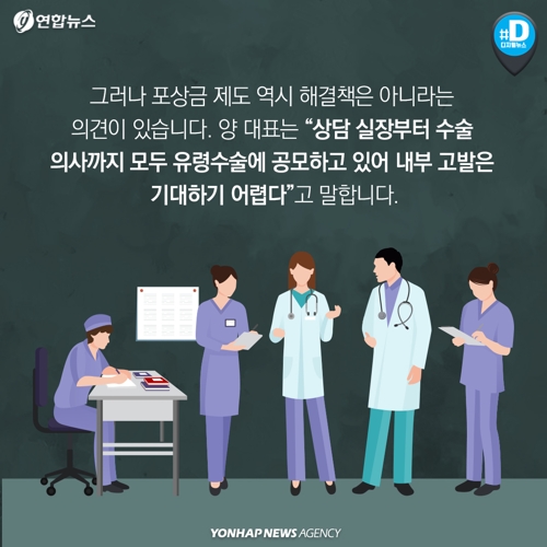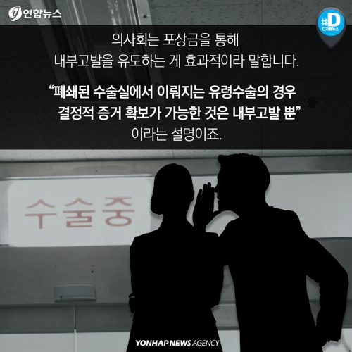 의사회는 포상금을 통해 내부고발을 유도하는 게 효과적이라 말합니다. "폐쇄된 수술실에서 이뤄지는 유령수술의 경우 결정적 증거 확보가 가능한 것은 내부고발 뿐"이라는 설명이죠.