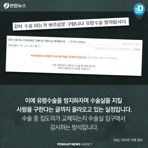 이에 유령수술을 방지하자며 수술실을 지킬 사람을 구한다는 글까지 올라오고 있는 실정입니다. 수술 중 집도의가 교체되는지 수술실 입구에서 감시하는 방식입니다.