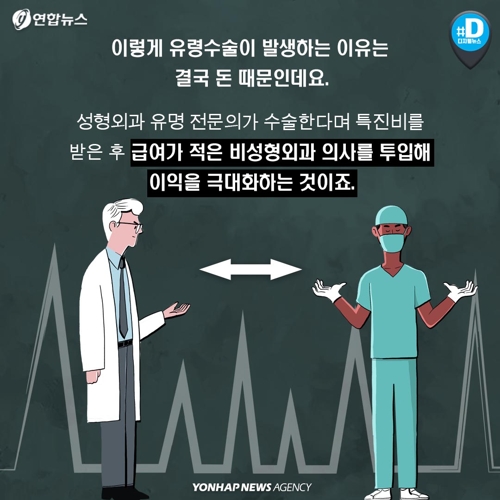 이렇게 유령수술이 발생하는 이유는 결국 돈 때문인데요. 성형외과 유명 전문의가 수술한다며 특진비를 받은 후 급여가 적은 비성형외과 의사를 투입해 이익을 극대화하는 것이죠.