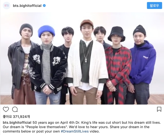 방탄소년단은 5일 공식 SNS에 "50년 전 4월 4일, 마틴 루터 킹의 인생은 짧게 끝났다. 하지만 그의 꿈은 여전히 살아있다”며 영상을 공개했다.