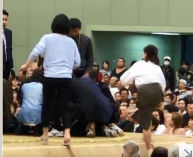 그러자 장내 아나운서를 맡은 스모 심판이 "여성은 도효에서 내려가라"고 수차례 방송했다.