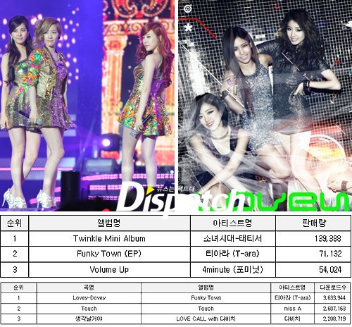 여자는 음반과 음원 선호도에 확연한 차이가 있었다. 우선 음반. '소녀시대' 유닛 '태티서'(13만 9,388장)가 여자 아이돌 그룹 중엔 유일하게 10만장 판매를 돌파하며 여유있게 1위를 기록했다. 차이는 있지만 티아라 '펑키 타운'(7만 1,132장), 포미닛 '볼륨업'(5만 4,024장)은 2,3위를 기록했다.