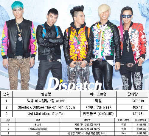 남자 음반 부문. '빅뱅'의 압승이었다. 우선 음반. 빅뱅의 미니 5집앨범 '얼라이브'는 총 26만 7,319장이 판매되되며 1위에 올랐다. 그 뒤는 '샤이니'의 셜록이었다. 샤이니는 총 16만 5,411장을 팔았다. '씨엔블루'는 총 12만 1,451장을 판매해 3위에 올랐다. 20만장을 넘긴 건 빅뱅이 유일했다.