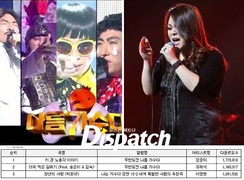 '나가수'는 현재 시즌2가 진행되고 있다. 지난해 김범수가 '제발'로 음원 다운로드 전체 3위를 기록한 것에 비하면 다소 저조한 성적이다. 하지만 프로젝트 음원 중 3위권에 이름을 올리면서 고정 팬층이 여전히 두텁다는 것을 증명했다. 아울러 시즌2의 존재가치도 나타냈다는 점이 인상적이다.