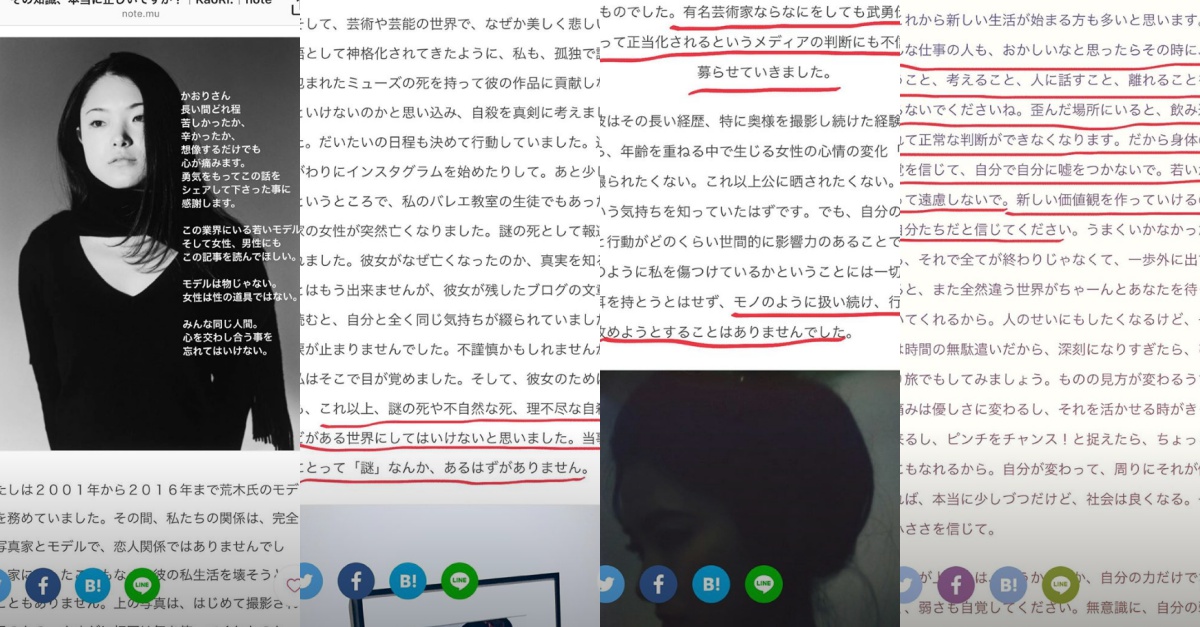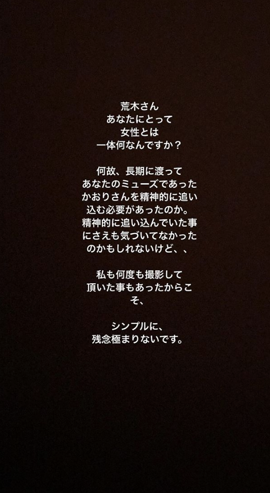 앞선 1일, 사진작가인 아라키 노부요시로부터 모델로서 존중받지 못했다고 주장하는 카오리라는 여성의 글이 온라인에 게재되며 논란은 시작됐다. 카오리는 2001년부터 2016년까지 아라키 노부요시의 뮤즈로 활동해왔는데, 촬영 당시 노출에 대한 동의는커녕 노출을 강요 당하거나 무보수로 일하는 등 처우를 당했다고 고발했다.