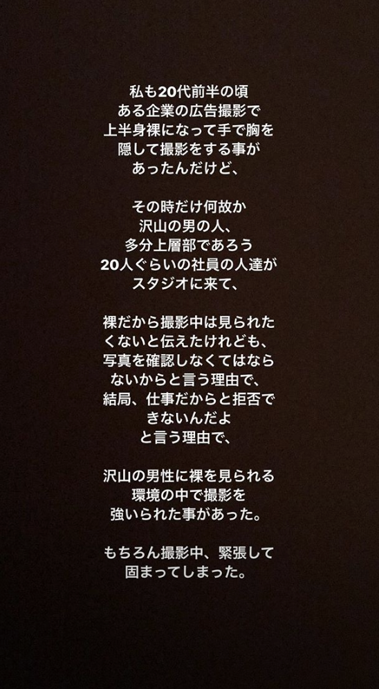 고백도 이어졌다. 미즈하라 키코는 "나도 20대 초반 기업 광고 촬영에서 상반신 노출에 손으로 가슴을 가리는 촬영을 했는데, 그때 많은 남자들, 어쩌면 고위층일 20명 정도의 직원들이 스튜디오에 와있었고, 노출 촬영은 보여주고 싶지 않다고 전했지만 사진을 확인하지 않으면 안 된다는 이유를 댔다. 결국 일이라서 거부할 수 없었고, 많은 사람들에게 알몸을 보이는 환경에서 촬용을 강요당했다"고 경험을 털어났다.