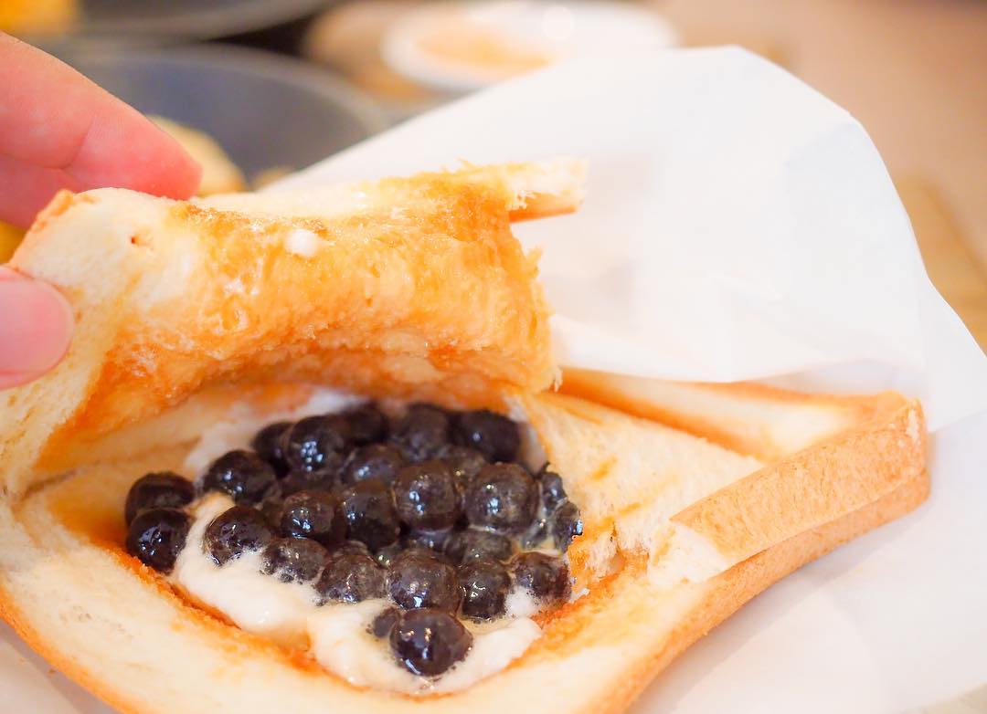 노릇하게 잘 구워진 식빵 속에 타피오카 펄이 잔뜩 들어간 모습입니다.