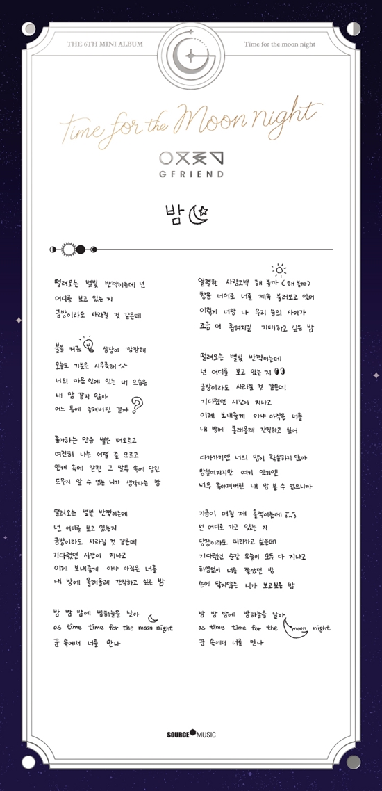 여자친구는 23일 공식 SNS에 6번째 미니앨범 '타임 포 더 문나잇'(Time for the moon night') 타이틀곡 '밤' 가사를 공개했다.