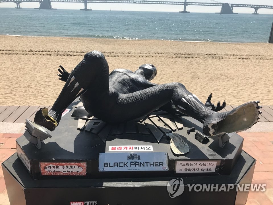 (부산=연합뉴스) 김재홍 기자 = 할리우드 블록버스터 최초의 부산촬영을 기념해 부산 광안리해수욕장에 설치된 블랙팬서 조형물의 파손은 술에 취한 회사원의 실수 때문으로 드러났다.