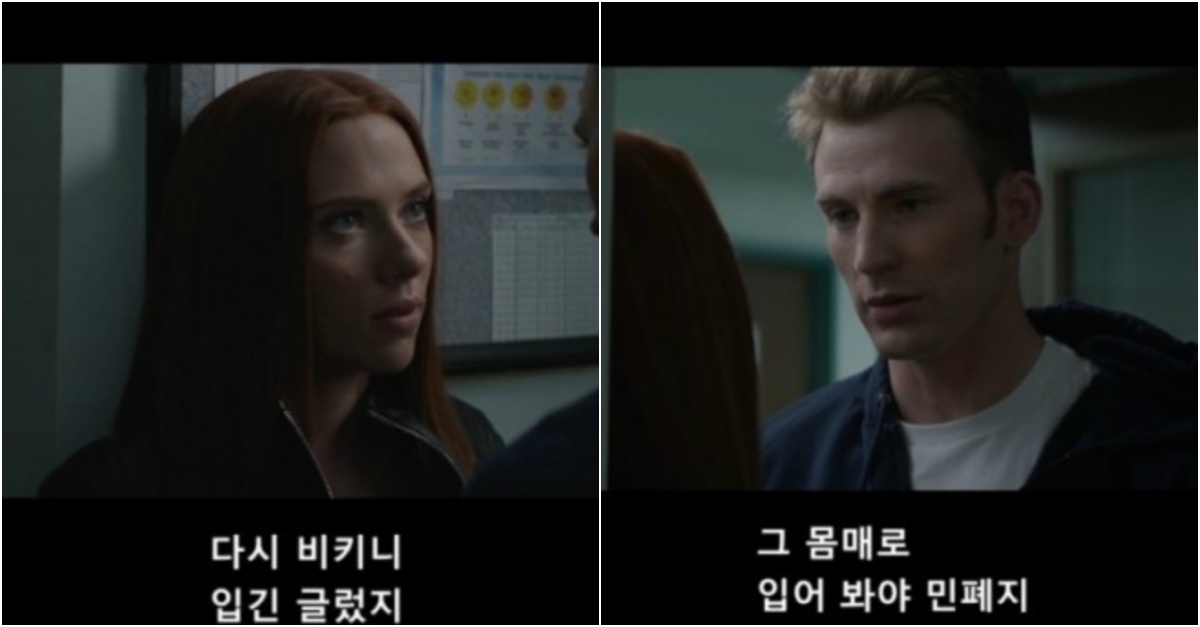 또 다른 장면은 캡틴 아메리카와 블랙 위도우(스칼렛 요한슨)의 대화 장면인데요. “비키니 입긴 글렀지“라는 블랙 위도우의 말에 캡틴 아메리카가 “Yeah, I bet you look terrible in them now”라고 말했는데요.