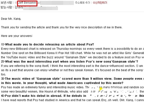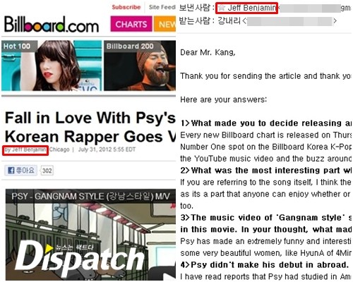 '디스패치'는 지난 6일 미국 현지에 있는 벤자민과 서면 인터뷰를 가졌다. "싸이는 생소한 K팝 가수였다. 소녀시대나 원더걸스, 빅뱅처럼 인지도가 있지 않았다"면서 "하지만 유투브에선 이미 열풍이 불고 있었다. 그에 대해 관심을 가질 수 밖에 없었다"는 말로 답변을 시작했다.