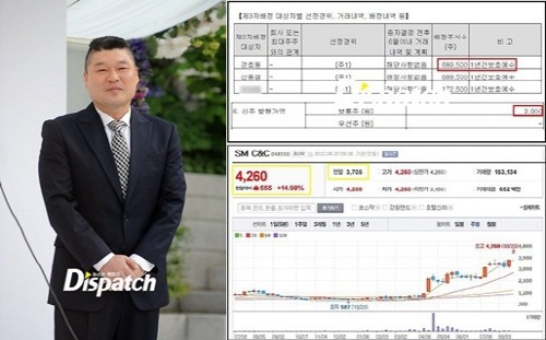 그도 그럴 것이 강호동은 복귀와 동시에 SM C&C의 유상증자에 참여했다. 3자 배정으로 68만 9,500주를 배정받았다. 유증가는 당시 시세보다 10% 저렴한 2,900원. 이틀이 지난 현재, 주가는 4,260원. 연일 상한가 행진이다.