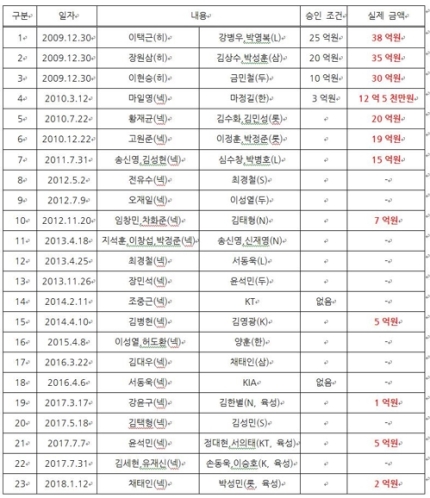현금이 끼지 않은 순수한 선수 트레이드로 알려진 황재균↔김수화·김민성(당시 롯데·2010년), 고원준↔이정훈·박정준(당시 롯데·2010년), 송신영·김성현↔심수창·박병호(당시 LG·2011년)에도 뒷돈이 각각 20억원, 19억원, 15억원이나 포함됐다고 KBO는 설명했다.