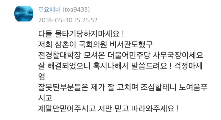 "삼촌이 국회의원 비서관도 했고 더불어민주당 사무국장이다. 잘 해결됐으니 혹시나 해서 말씀드린다. 잘못된 부분들이 있다면 벌 받고 고치겠다"고 댓글을 단 거죠.