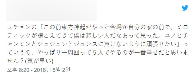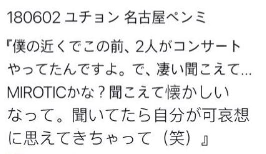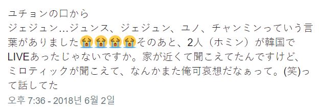 "유천의 입에서 '재중, 준수, 재중, 윤호, 창민'이라는 말이 있었습니다. 그 뒤 두 사람(최강창민, 유노윤호)이 한 한국 라이브 있었잖아요. 집이 가까워 들렸는데, '미로틱'이 들려서 뭔가 '나 불쌍하다' 라는 이야기 했어요"