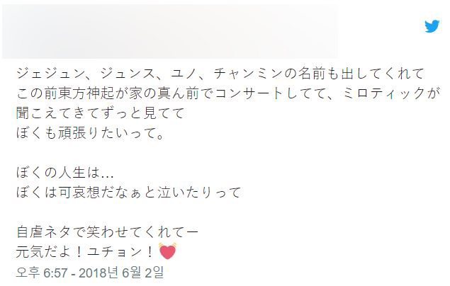 "재중, 준수, 윤호, 창민 이름도 얘기하고. 얼마 전 동방신기가 집앞에서 콘서트해서 '미로틱' 들려서, 나도 열심히 하고 싶다고. 내 인생은, 나는 불쌍하구나-하고 울고. 자학 이야기로 웃겨 주었어. 잘 지냈어! 유천!"
