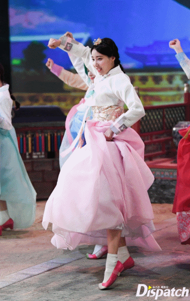 분위기 후끈 달아올랐나요? 지금부터 동서양의 조화를 보여드리겠습니다. 한복 입고 본격 셔플 댄스 시작합니다. 배경음악, '배엠' 틀어주세요.