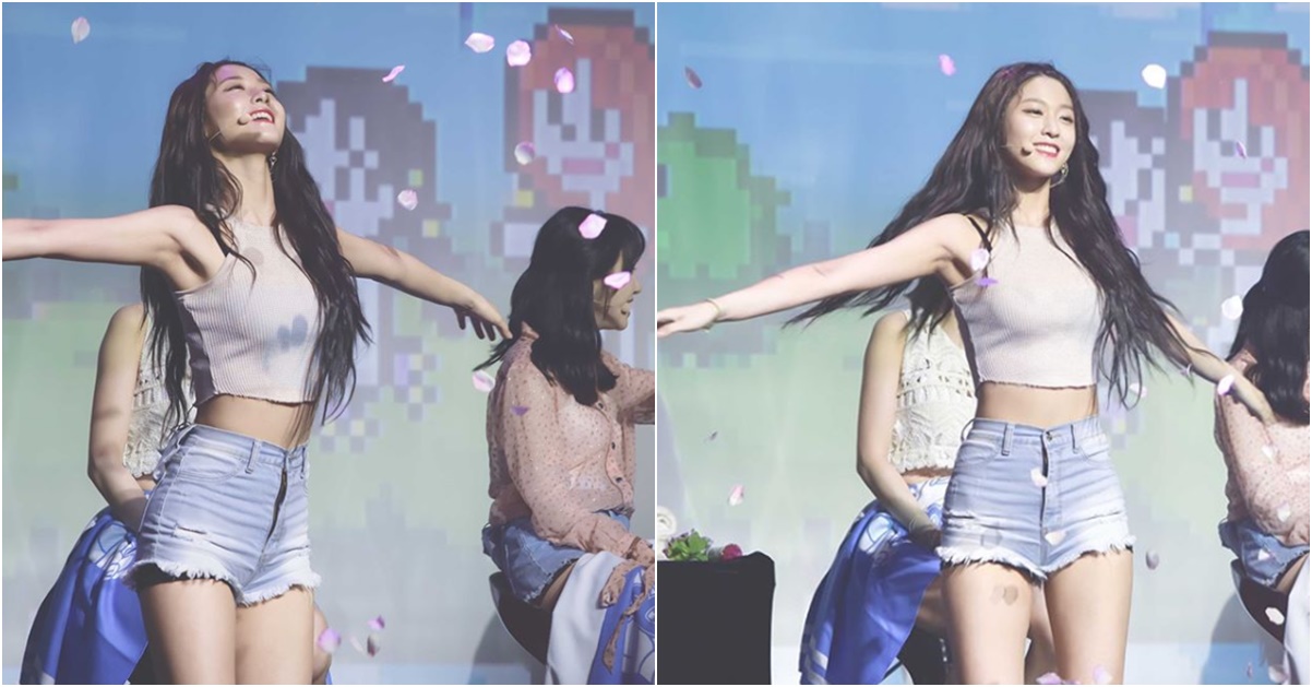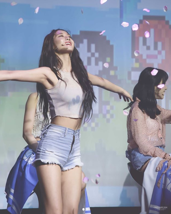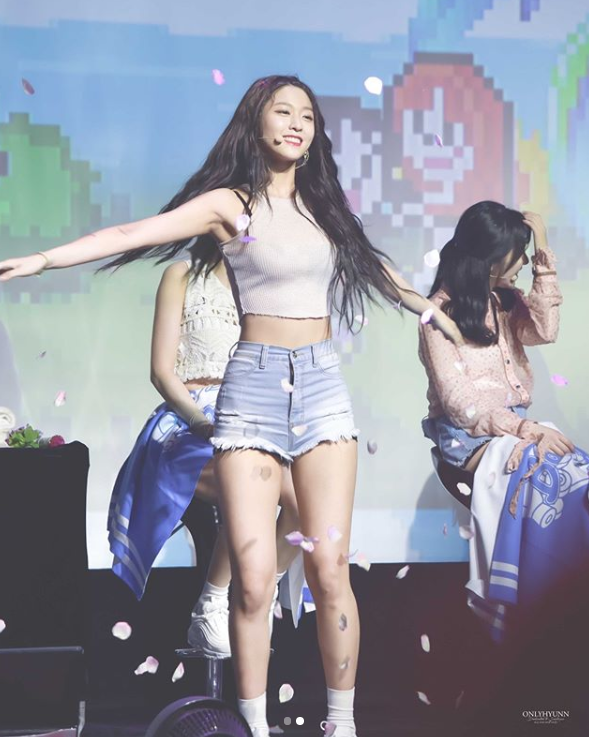 사진 속 설현은 설명대로 행복하게 웃고 있는 모습. 이 사진은 설현의 무대 위 모습을 담은 것으로 그녀는 크롭 탑에 핫팬츠로 특유의 8등신 몸매를 마음껏 뽐냈다.