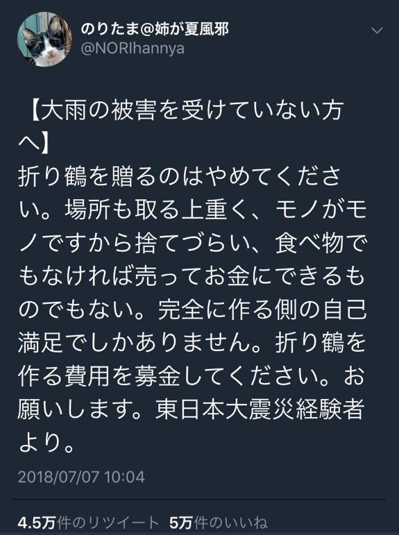 과거 동일본 지진피해 경험을 했다는 한 네티즌은 자신의 SNS에 장문의 글을 올렸습니다. "종이학을 접어서 보내는 건 하지 마라. 공간만 차지하고, 물건이 물건인지라 함부로 버리기도 힘들다. 먹을 수도 없고 팔아서 돈으로 바꿀 수도 없다", "완전히 자기 만족에 불과하다. 종이학을 만드는 비용으로 차라리 모금을 해달라"고 주장했습니다.