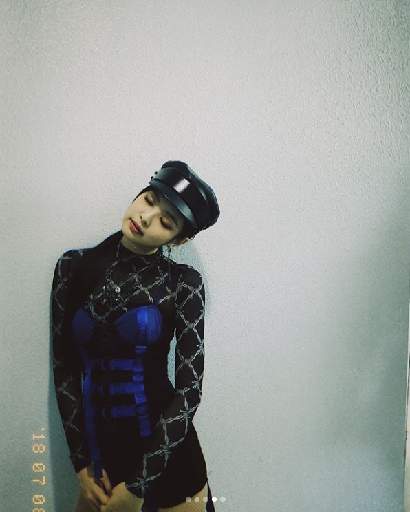 의상은 독특했습니다. 블랙 시스루에 파란색 코르셋을 매치한 건데요. 여기에 각 잡힌 모자로 스타일링을 완성했습니다.