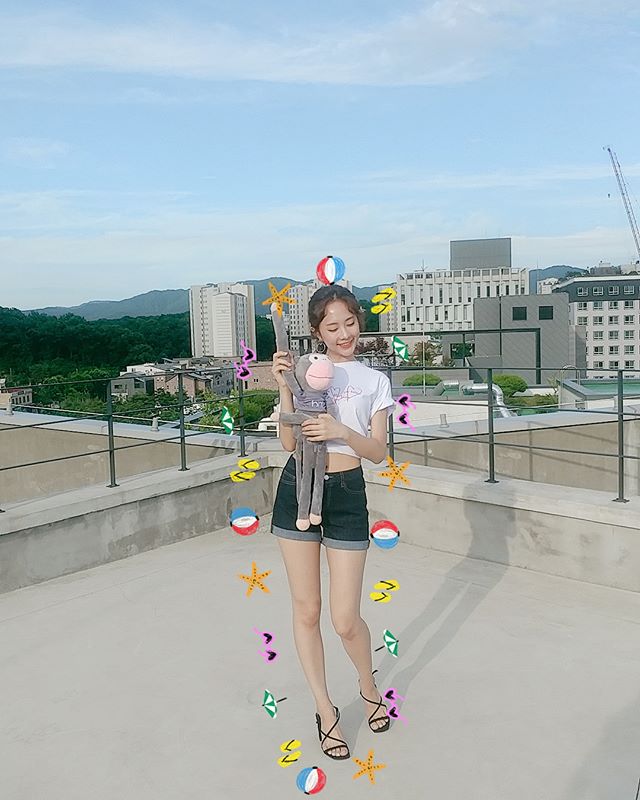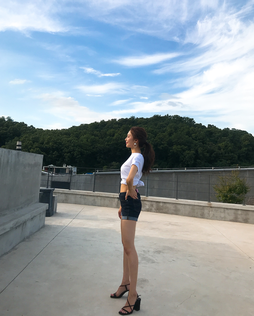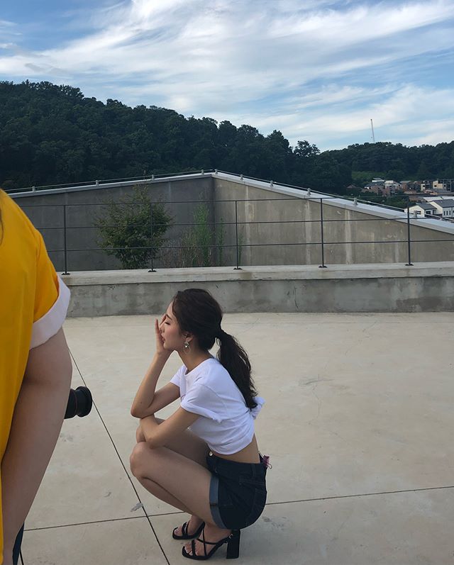 늘씬한 바디라인이 눈길을 끕니다. 그는 크롭티와 데님팬츠로 탄탄한 허리를 드러냈죠. 독보적인 다리 길이도 인상적인데요.