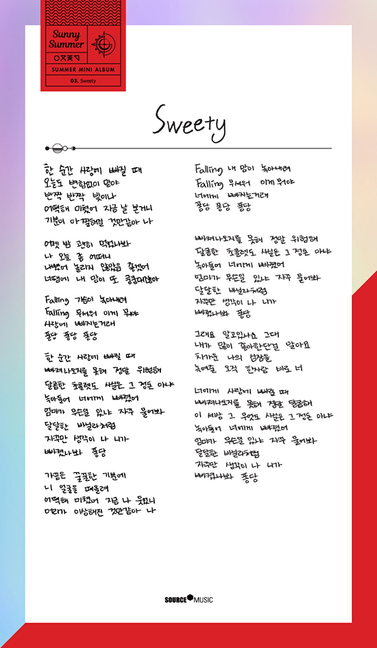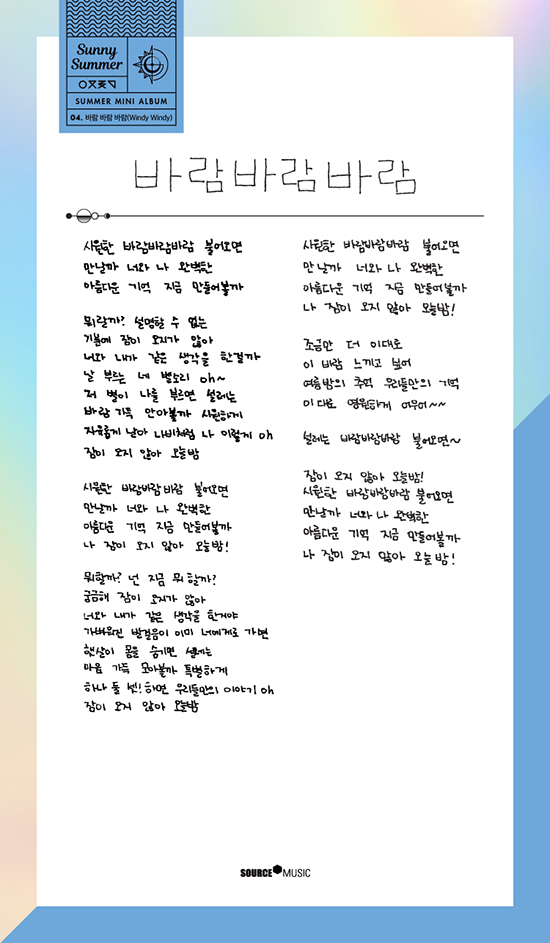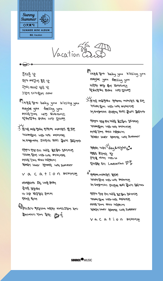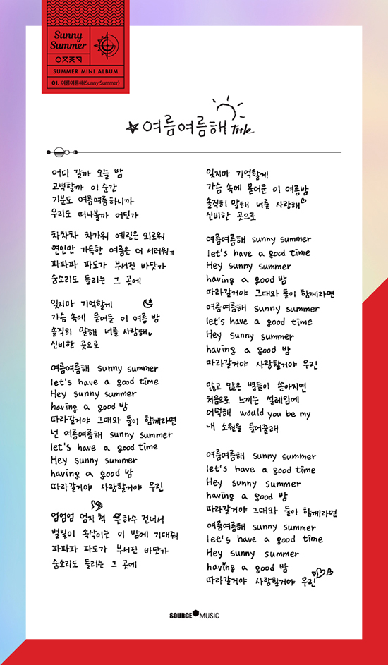 [Dispatch=오명주기자] ‘여자친구’가 직접 손 글씨로 여름을 표현했다. 14일 공식 SNS에 새 미니앨범 ‘써니 써머’(Sunny Summer) 전곡 가사를 공개했다.