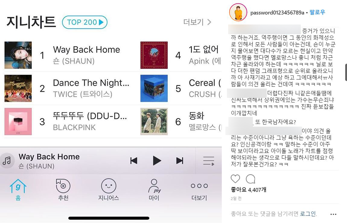 이 노래는 2일 전 지니차트에서 1위에 올랐습니다. 트와이스와 블랙핑크를 꺾은 거죠. 이에 숀조차 인스타그램에 해당 차트를 캡처해 올리며 "저기 이거 뭐야?"라고 했습니다.
