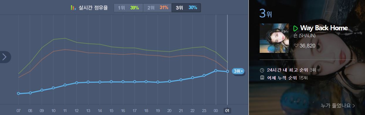 이 곡은 지난 15일 오전 7시에는 멜론 43위였습니다. 이어 1시간 단위로 39위->21위->13위->11위 식으로 순위가 급상승했습니다.