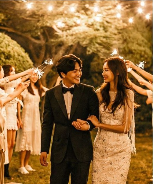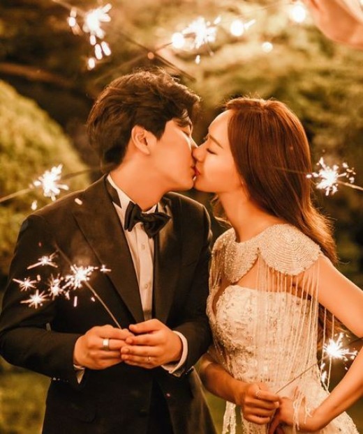 우승희는 전날에는 남편 이수환 영상 감독도 나온 화보를 공개했다. 불꽃놀이가 펼쳐지는 화려한 배경 속에 예비 부부가 키스를 나누는 모습이 담겼다. 우승희는 "완벽한드레스와 헤어메이크업 그리고 예쁜 야외 정원까지... 모든게 완벽했던 나의 웨딩촬영"이라고 덧붙였다.
