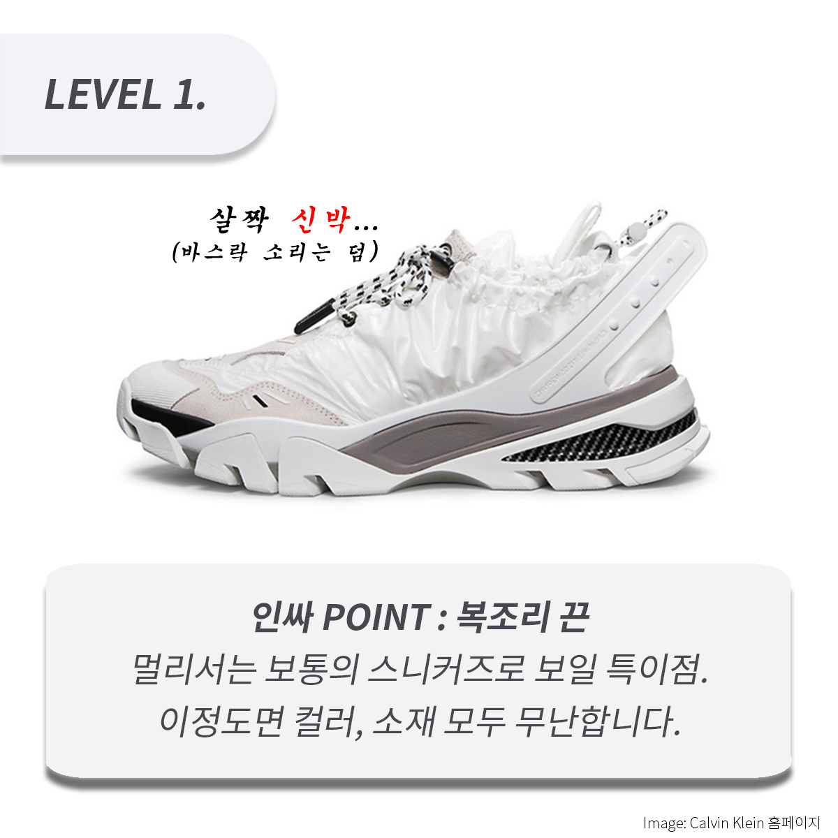 레벨 1은 가볍게 시작해볼까요? 이 스니커즈는 스트링을 조절해서 신을 수 있는데요.