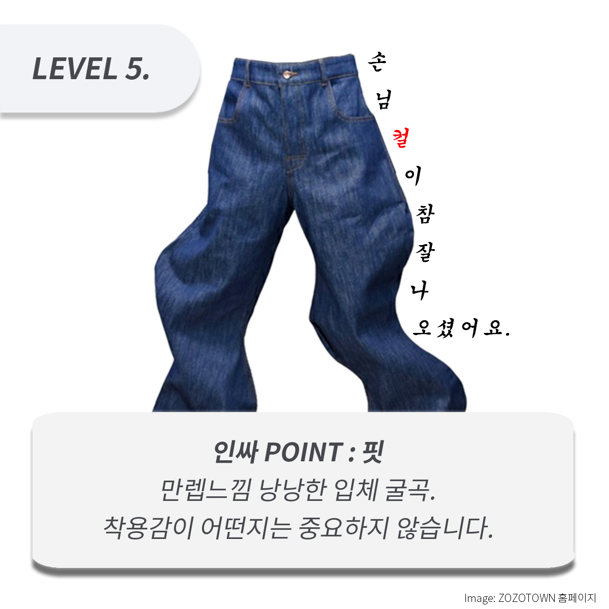 잘 버티고 오셨네요. 레벨 5는 곡선이 매력적인 데님팬츠입니다.