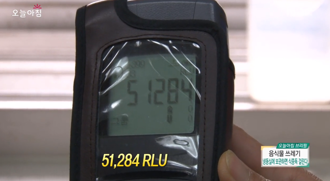 먼저 실온 음식물 쓰레기 봉투 세균 수치입니다. 51,284 RLU가 나왔는데요. 냉동실 음식물 쓰레기 봉투는 어땠을까요?