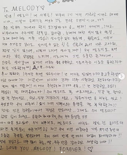 서은광은 이날 인스타그램에 "안녕 멜로디(팬클럽), 내 사람들! 비투비 1기 리더 서은광이라고 해"라며 손편지를 올렸다.