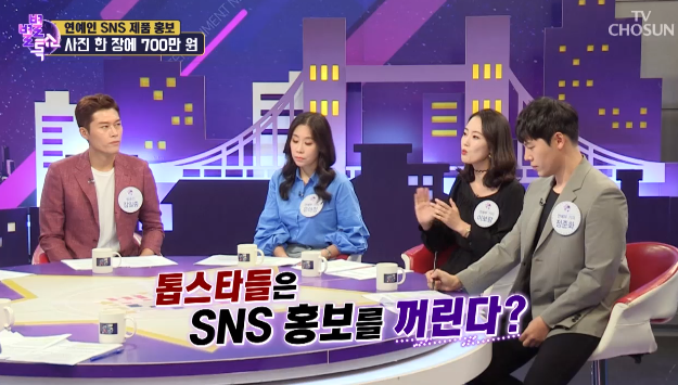TV조선 ‘별별톡쇼’에서는 연예인 SNS 제품 홍보에 대해 이야기를 나눴습니다.