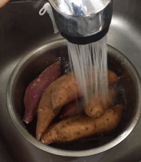 흐르는 물에 고구마를 씻어주면