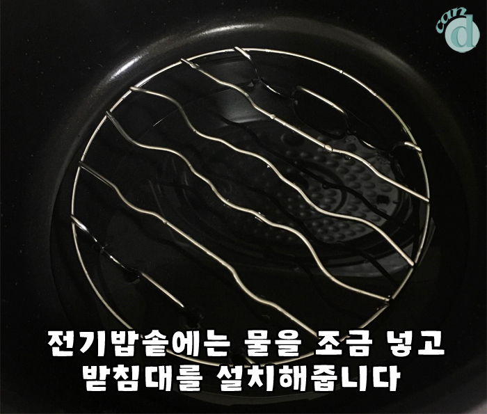 전기밥솥의 솥에는 물을 조금 넣어줍니다. 살짝 바닥을 채우는 정도로 넣어주면 됩니다.