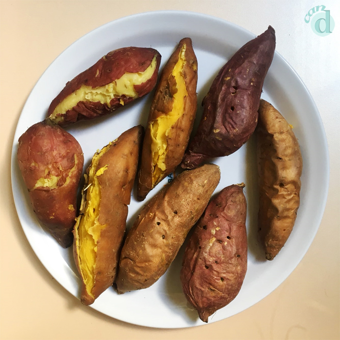 빨간 부분은 전기밥솥으로 찐 고구마고, 노란 부분은 에어프라이어로 구운 고구마입니다.