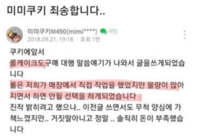 회원들이 잇달아 의혹을 제기하자, '미미쿠키' 측은 "롤은 저희가 매장에서 직접 작업했었지만, 물량이 많아지면서 하면 안될 선택을 하게 됐다"고 인정했습니다.