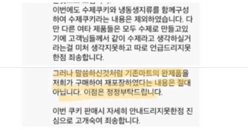 논란이 되자 '미미쿠키' 측은 "냉동생지를 오븐에 구운 것"이라고 변명했습니다. "기존 마트의 완제품을 구매해 재포장했다는 건 사실이 아니다"고 덧붙였죠.