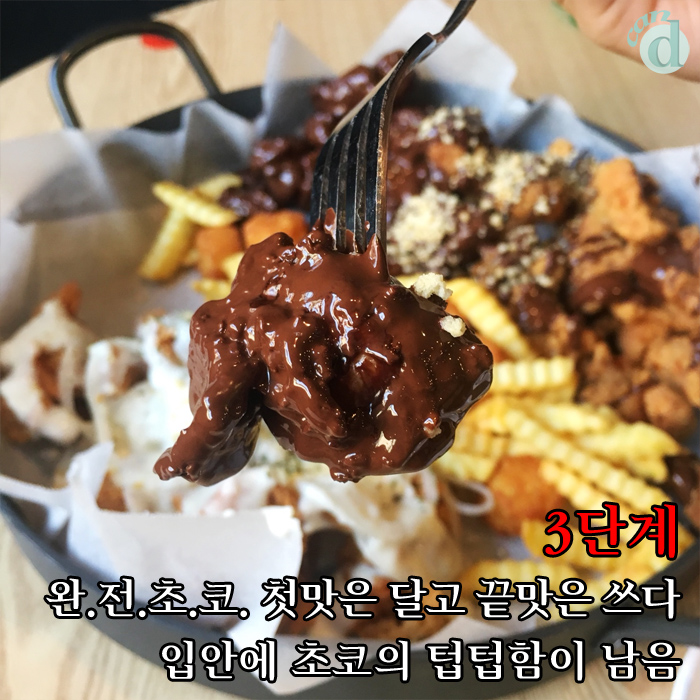 3단계는 완.전.초.코입니다. 첫맛은 달고 끝맛은 씁니다. 입안에 초코가 남기 때문인데요. 단맛이 가시고 나면 텁텁함이 남아 '아 이게 초코치킨이구나'라는 생각이 듭니다.