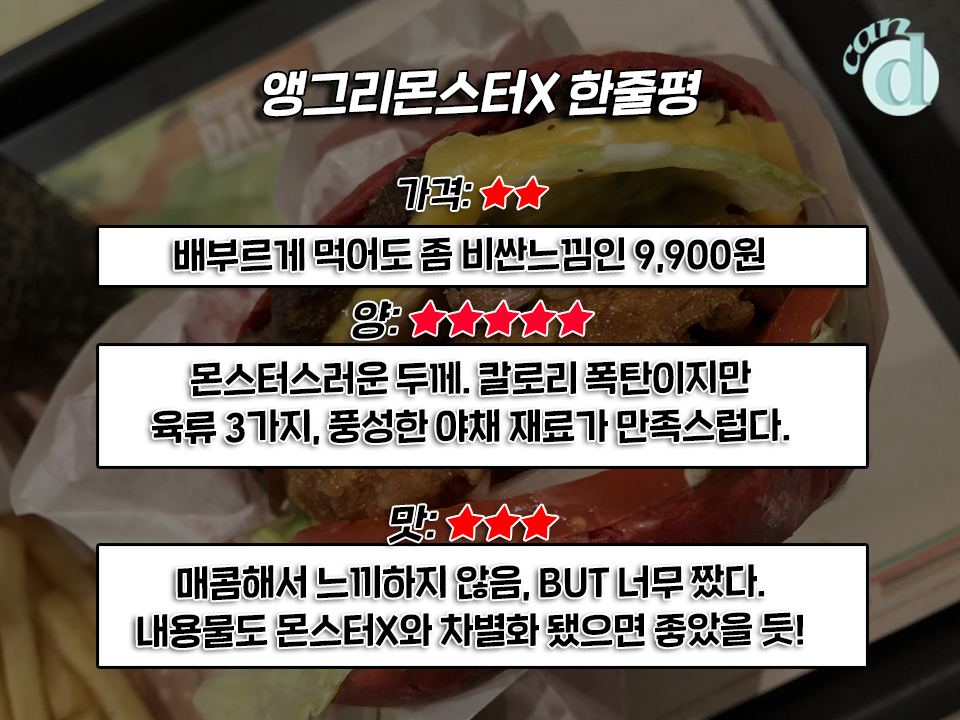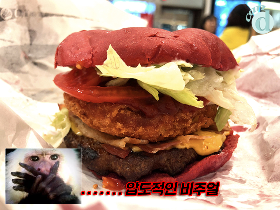 그래도 비주얼적으로는 훨씬 만족스러웠는데요. 마치... 정말 화난 햄버거를 야무지게 먹는 느낌(?).
