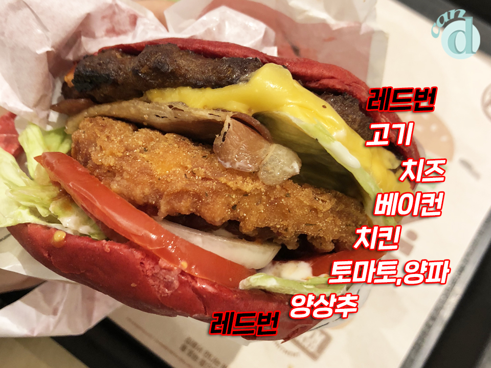 내용물은 레드번, 양상추, 토마토, 양파, 치킨패티, 베이컨, 치즈, 소고기패티로 구성돼 있고요.
