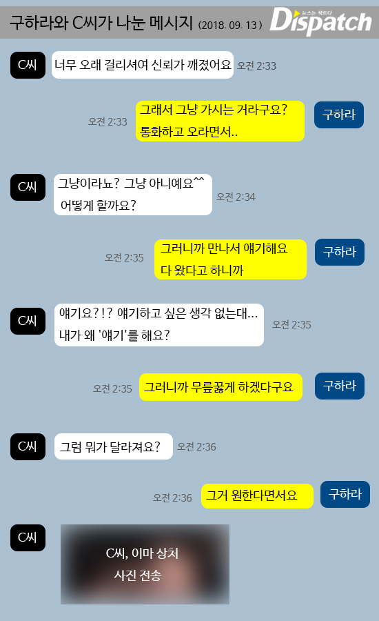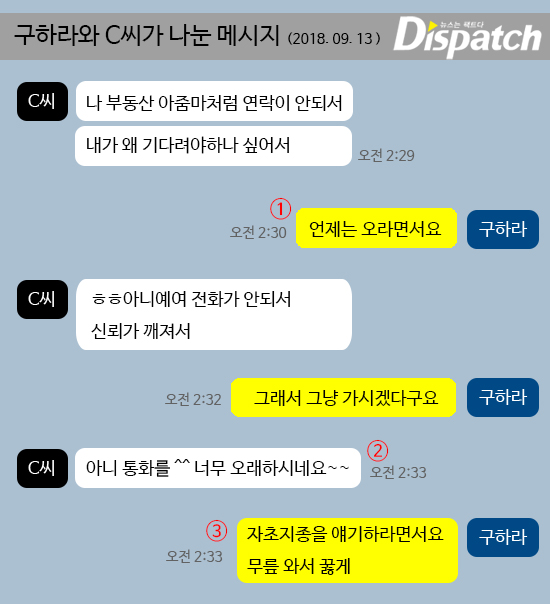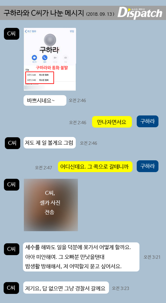 C씨는 되레 불만을 표했다. "통화를 너무 오래한다"며 빈정거렸다. 구하라는 다시 해명했다. "자초지종을 설명하느라 (통화가) 길어졌다"고 덧붙였다.